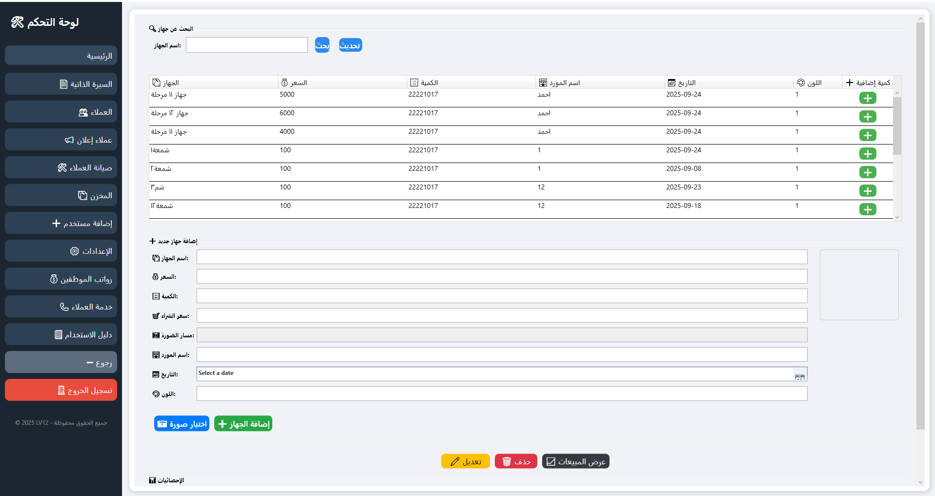 # | العميل | المنتج | الكمية | السعر | طريقة الدفع | التاريخ | إجراءات |